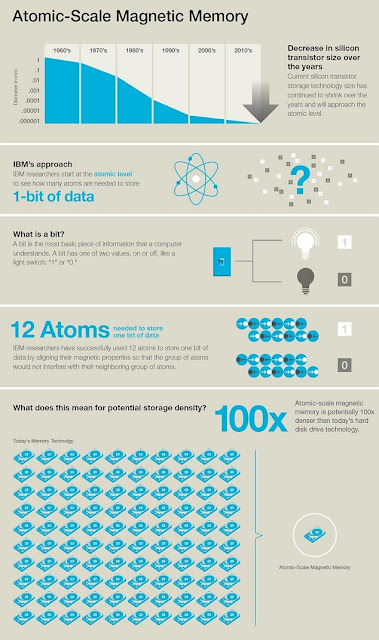 In ziua de astazi un bit (cantitatea de informație necesară pentru reducerea incertitudinii la jumătate) este stocat in aproximativ 1 milion de atomi .Cercetatorii IBM au reusit sa stocheze un bit in 12 atomi - două rânduri de cîte 6 atomi